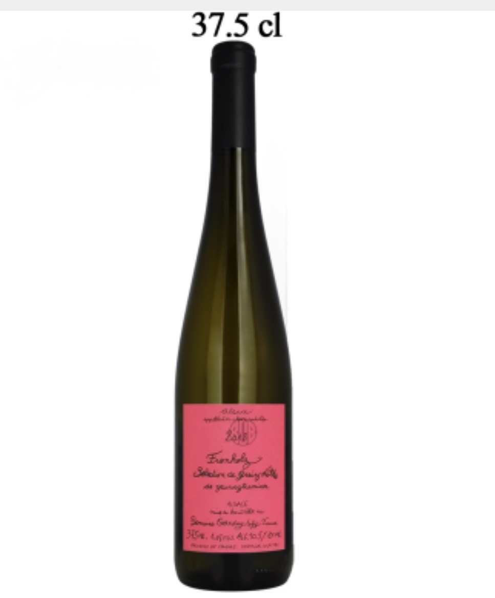 Gewurztraminer - Fronholz - Selection de Grains Nobles - Domaine Ostertag - 2018Les notes sensuelles et gourmandes d’ananas et d’abricot confits, de gelée de coing et de litchi, d’essence de rose, d’orange sanguine et de mandarine confite s’entremêlent avec le gingembre mariné, la poudre de noix de muscade, la ras el-hanout, le poivre vert ou la cardamome. Aux évocations de confiture de mirabelle et de pêche jaune répondent des nuances de curcuma et de cumin. On adore cette sensation sphérique, tournoyante, qui anime sans cesse ce précieux nectar, au nez comme en bouche. Son toucher est extraordinairement doux et soyeux, déposant sur chaque papille un concentré de fruits confits et d’épices réconfortantes. Aux arômes déjà présents au nez, on pourrait rajouter maintenant la mangue, le suc de fleurs jaunes et l’extrait de bergamote. Plus on avance vers la finale, plus s’affirme une dimension poivrée, évoquant l’énergie croquante, presque citronnée, d’une baie de Sichuan ou d’un poivre Timut. L’équilibre entre suavité et tonicité est admirable. Ce splendide Gewurztraminer Fronholz en Sélection de Grains Nobles appelle de toute ses forces un foie gras mi-cuit !
