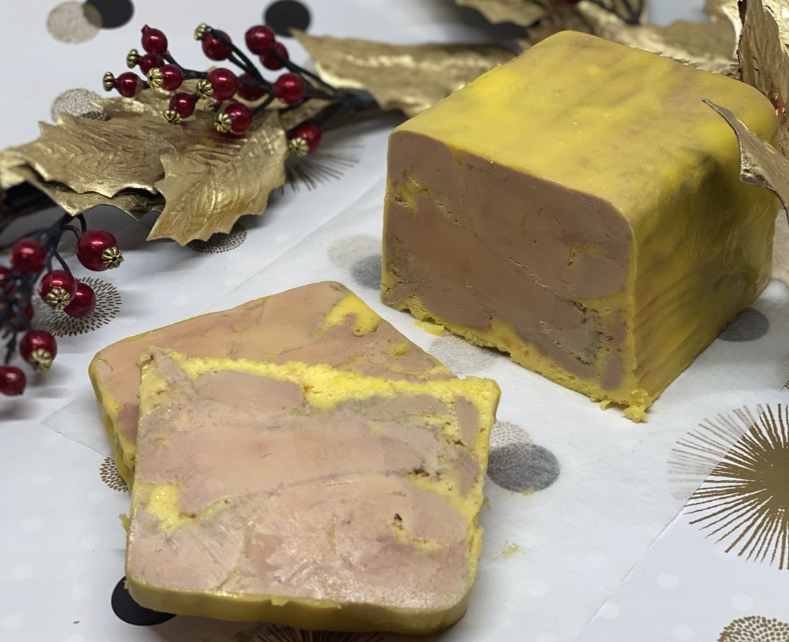 La recette traditionnelle du foie gras. Juste assaisonné cuit en terrine au bain marie. Vendu sous vide, environ 1kg